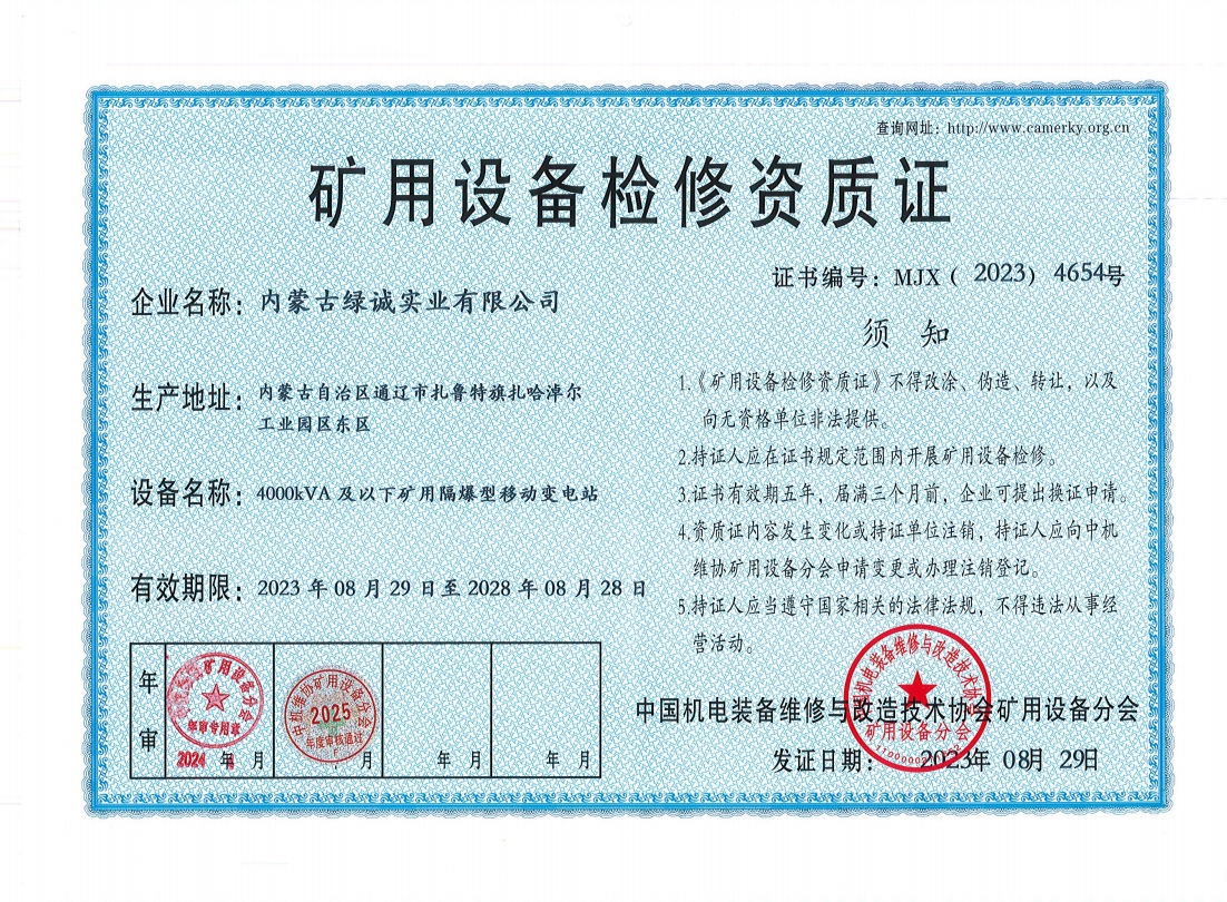 2018年我公司通過中國機電裝備維修與改造技術協會礦用設備分會審核并取得了9項礦用設備檢修資質證書。公司本著“誠信為本 質量為先 全心全意為客戶 ”的服務理念,圓滿完成各個廠礦的機械維修及配套服務,期待與您共同合作。